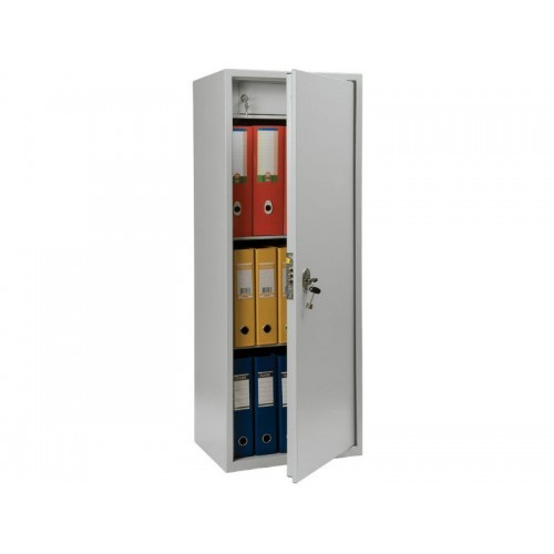 Корпус изделия изготовлен из стали толщиной 1,2 мм и покрыт полимерно-порошковой краской светло-серого цвета RAL 7035. Бухгалтерский шкаф укомплектован ключевым замком "Практик".