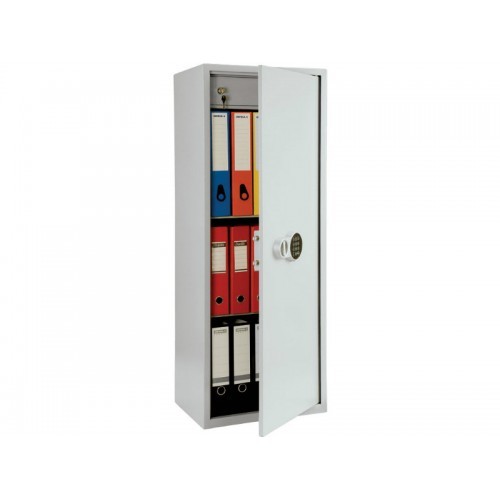Корпус изделия изготовлен из стали толщиной 1,2 мм и покрыт полимерно-порошковой краской светло-серого цвета RAL 7035. Бухгалтерский шкаф укомплектован электронным замком PLS-1.