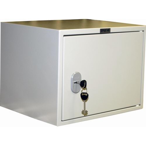 Корпус изделия изготовлен из стали толщиной 1,2 мм и покрыт полимерно-порошковой краской светло-серого цвета RAL 7035. Бухгалтерский шкаф укомплектован ключевым замком "Практик".