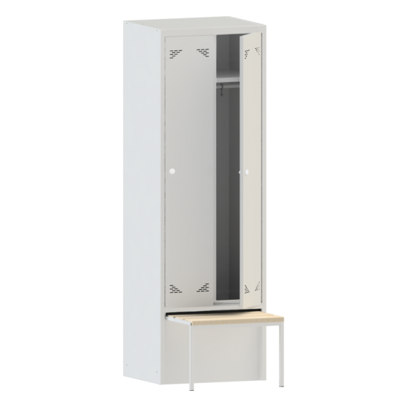 Гардеробный шкаф для одежды ШО 2С/800 (2 секции) предназначен для хранения сменной одежды в спортивных, производственных и прочих помещениях. Комплект поставки включает полки для головных уборов, перекладины для вешалок и крючки для одежды. Оборудован выдвижной лавкой.