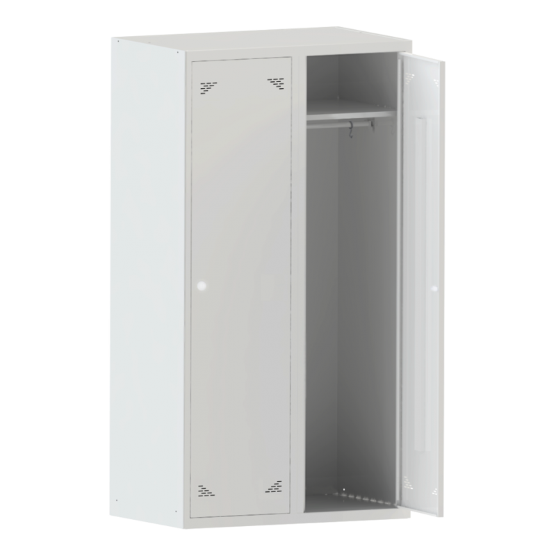 Изделие имеет прочную сварную конструкцию с порошково-полимерным покрытием светло-серого цвета. Гардеробный шкаф оснащен вентиляционными отверстиями и запирается на ключевой замок Euro Locks.