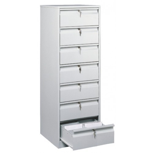 Картотечный шкаф ТК7 предназначен для удобного и надежного хранения документов всевозможных форматов, материальных ценностей. Шкаф оснащен центральным замком на каждый ящик и ячейками (7 ящиков с продольным разделением на две части) для хранения карточек формата А5, CD/DVD дисков и видеокассет.
