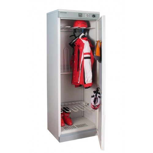 Сушилка выполнена из стали высокого качества и покрыта полимерной краской светло-серого цвета (RAL 7047). Дверцы шкафа запираются на почтовый замок. Есть возможность подсоединения к вытяжной вентиляции.