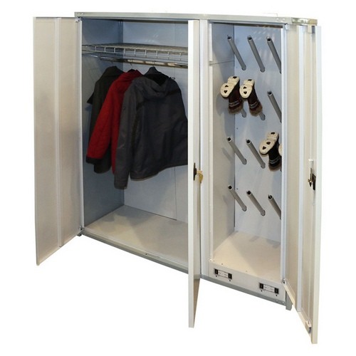 Первая двухдверная для просушивания одежды, снабжена перекладиной для вешалок и полкой для головных уборов. Вторая секция предназначена для сушки обуви и оборудована специальными штангами для развешивания и просушки обуви.