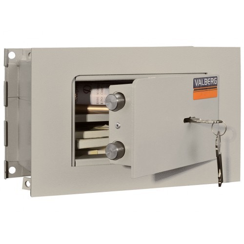 Изделие выполнено из стали высокого качества с порошковым покрытием серого цвета. Толщина лицевой панели составляет 5 мм. Сейф оснащен ключевым замком Kaba Mauer (Германия) с ригельной системой системой запирания и защитой от высверливания.