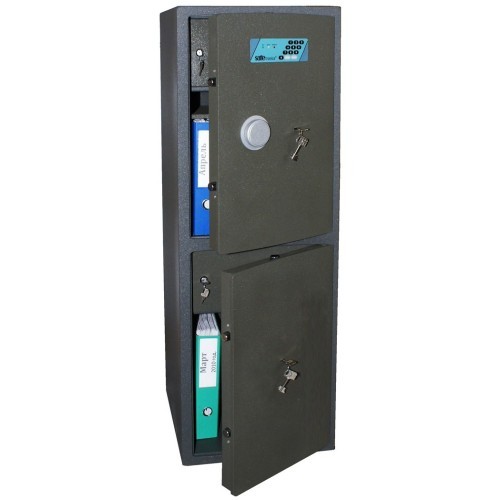 Область замка сейфа отделана двумя пластинами из марганцовистой стали, оберегающими замок сейфа от высверливания. Предусмотрено крепление к полу на два анкера. Внутренние размеры 612х395х379 мм.